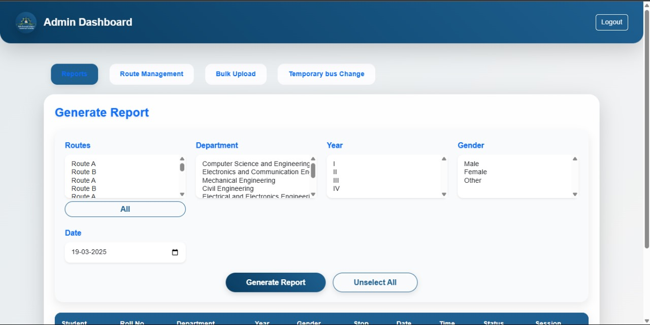 NSCET Transport is a smart Bus Attendance System designed to ensure safe and efficient transportation for NSCET students and staff. It tracks real-time boarding and deboarding, minimizes errors, and provides instant updates. The app enhances safety, accountability, and convenience, ensuring a seamless commuting experience for all users.